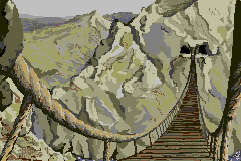 ContentsPlaying the gameGraphics (Commodore 64 versus Amiga) Publication overview and some notes for collectors Solution and images (spoiler alert!) Links Playing the gameAt the beginning of the story, you, the player, are given a sketchy outline of the circumstances that brought you from your own environs to the land of Kerovnia with no knowledge of the reason or your purpose. Wandering around, you find that you have been given a wristband that prevents you from crossing the border of the country. So begins the quest to remove the wristband, which involves a tour of encounters with a number of colorful characters such as a magician, a guru, and a legless horse. Along the way you must solve a number of puzzles, and if all goes well and 350 points later you may be released from Kerovnia. Kerovnia is a strange place; an unusual amalgamation of fairy figures, such as a dragon, a princess, and a talking horse, combined with some more exotic characters such as a guru, a group of alchemists and none less than Jerry Lee Lewis, who plays a grand piano with a lid that opens on the wrong side. There are some playful references to the tropes of text adventures as they were at the time. A maze at the edge of the map with no other purpose than to leave it again, for instance. A slightly incoherent experience all in all, more like a collection of little ideas. On the other hand, is real life coherent? I don't think so. Replaying the game after some thirty years makes it clear that this story is not quite as good-natured as it is entertaining. In the beginning you are given an assignment to kill an adventurer that is questing to rescue a princess - a princess that you may then yourself release from confinement in an ice tower. However, doing the latter will leave you with fewer points than leaving the princess where she is and opting for another course of action, which itself seems to have little purpose for an uninformed foreigner in Kerovnia. In another nook of the map, you can increase your score by improving a little plant's living circumstances. For someone who cares about the fate of his NPC's this may be somewhat disturbing, and some have opined that this game is somewhat cruel. Thirteen hobbits would probably agree. Graphics (Commodore 64 versus Amiga)Some versions of The Pawn featured bit-mapped images, as opposed to the crude vector-drawn pictures that could be found in some contemporary adventure games. Revisiting Kerovnia in the present day gives the opportunity to make a side-by-side comparison of the thirty images featured in two popular ports, for the Commodore 64 and the Amiga. The 16-bit Commodore Amiga had been released one year before the introduction of The Pawn. This computer is regarded by some to be the first "multi-media computer", offering better sound and graphics than other machines of the era. However, the bitmap images featuring in this adventure (with the exception of the splash screen) are the same as for the Atari ST with a resolution of 320x200 pixels and 16 colors out of a palette of 256. The 8-bit Commodore 64 had been introduced in 1982 and offered comparitively modest capabilities. Multicolor mode on a C64 meant a resolution of 160x200 pixels and a choice of 16 fixed colors, with a further limitation of a maximum of four colors per 4x8 pixel block. Some downscaling in size and color depth was obviously necessary. Below is a number of comparisons between the graphics of the two platforms at a few locations. The C64 version is on the left, and the Amiga version on the right. The C64 images all have the same size and are rendered using non-square pixels that are twice as wide as they are high. The Amiga images have slightly varying sizes and aspect ratios.